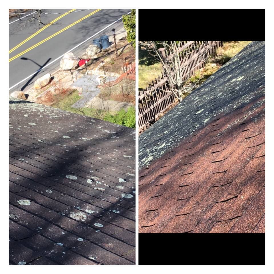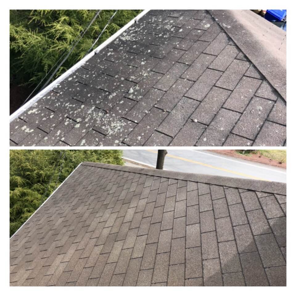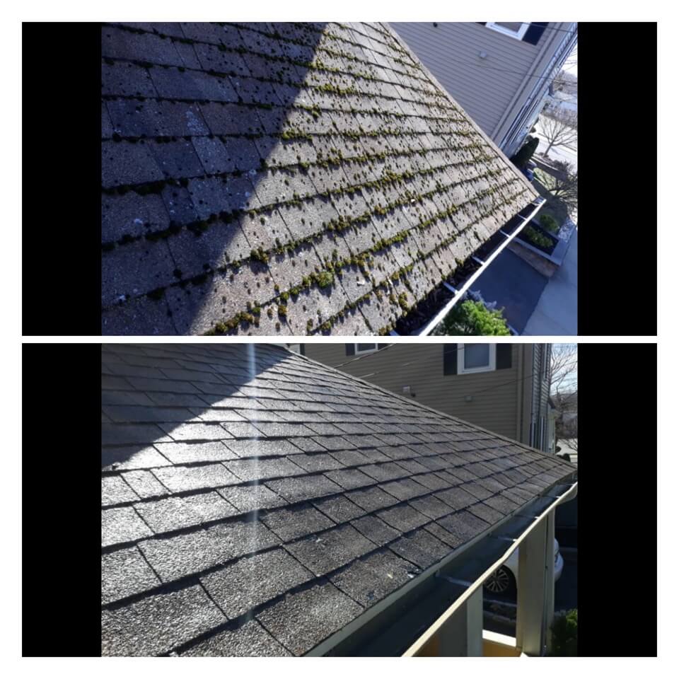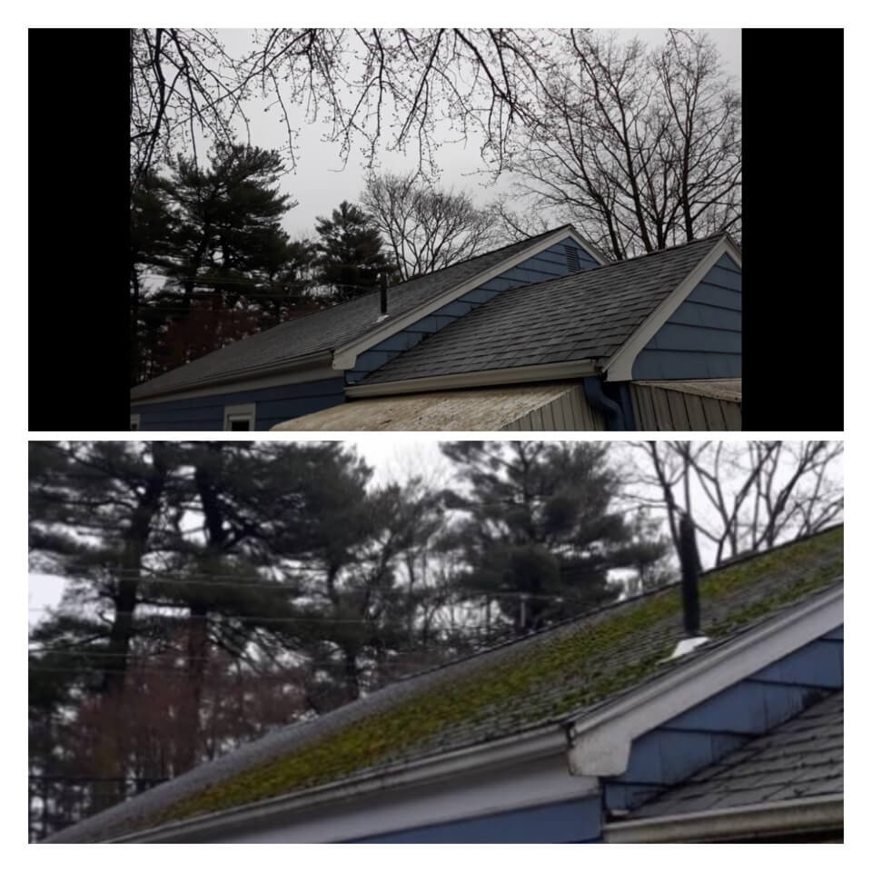 HiCleaners is the most experienced company in Foxborough, MA that deals with roof washing and roof soft washing. All of our employees are trained to recognize precise solution mixing ratios to provide you with the safest and most effective soft washing service. Roofs are a commonly neglected part of a house due to the fact that most people don’t have ladders to access it, so it is very easy to just leave it alone and forget about problems that may start to arise. Just like many home owners, discoloration and small bits of moss on a roof can be overlooked because of the misconception that it is just aesthetic. However, it isn’t just aesthetic, the moss slowly lifts the granules off the shingles which in turn shorten the life of the shingle. The moss also spreads, just like any bacteria if it is left alone for too long, it can quickly become a problem that spirals out of control. Call HiCleaners for a free quote, we only use the most advanced eco-friendly solutions and equipment to make sure the job is done right, for the safety of the employees, your plants, grass, pets, and children.